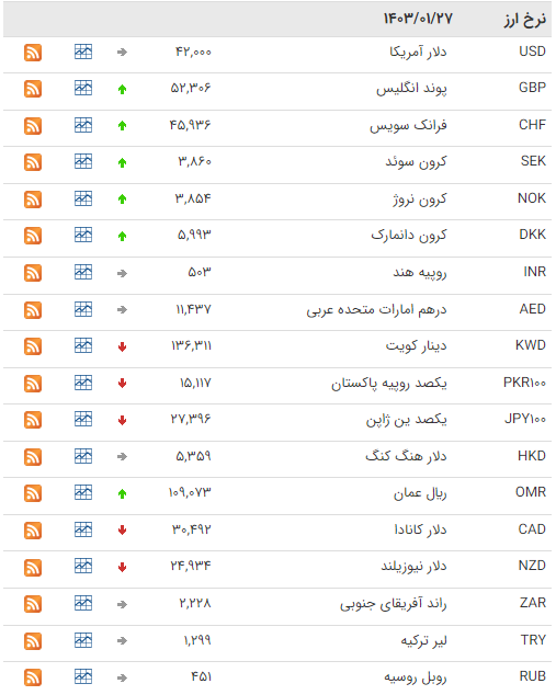 امروز ( دوشنبه 27 فروردین ماه) نرخ هر پوند 52 هزار و 306 ریال و یورو 44 هزار و725 ریال اعلام شد.