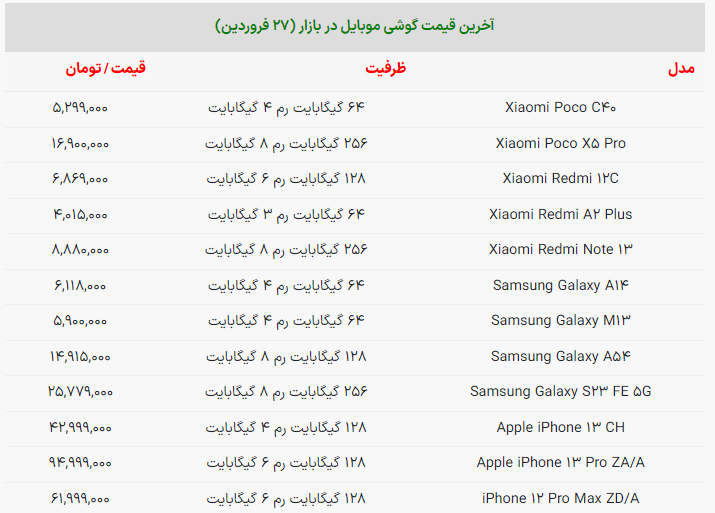جدیدترین قیمت گوشیهای سامسونگ، شیائومی و آیفون به شرح زیر است.