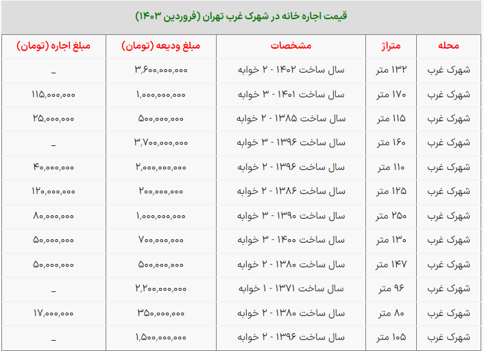 در گزارش زیر به بررسی قیمت اجاره خانهها در شهرک غرب تهران میپردازیم.