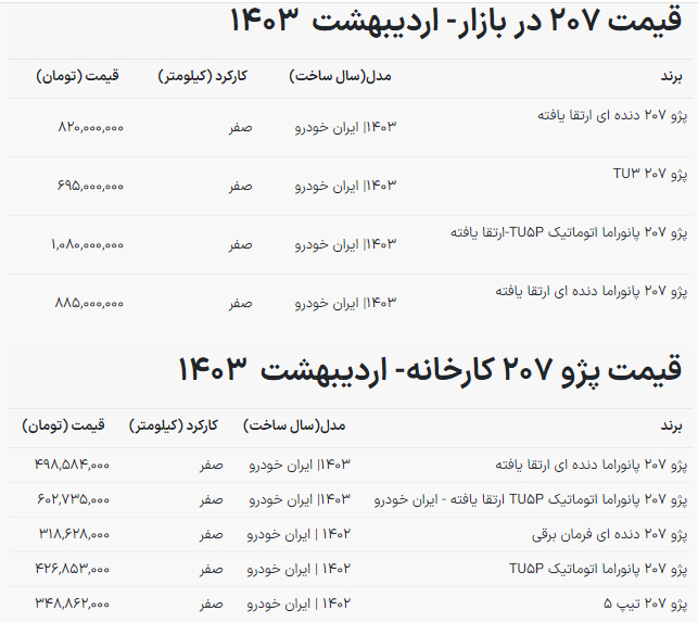 بر اساس جدیدترین قیمت محصولات ایران خودرو در بازار آزاد، قیمت ۲۰۷ ارتقا یافته مدل ۱۴۰۳ به ۸۲۰ میلیون تومان رسیده است. همچنین قیمت ۲۰۷ پانوراما اتوماتیک TU۵P-ارتقا یافته نیز یک میلیاردو۸۰ میلیون تومان است.