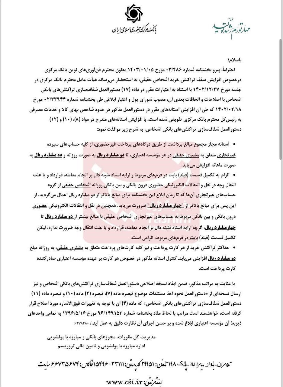 بانک مرکزی 27 اسفندماه سال 1402 مصوب کرد تا سقف برداشت از حساب های مشتریان حقیقی بانکها بصورت غیر حضوری روزانه از 100 میلیون تومان به 200 میلیون تومان و ماهانه به ده میلیارد ریال افزایش یابد.