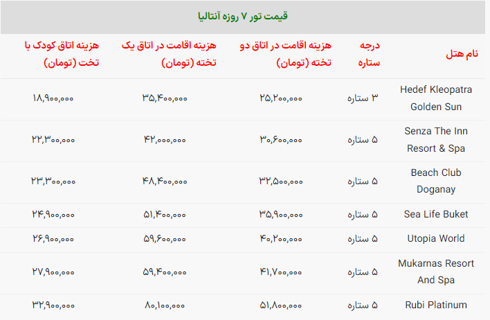 برای اطلاع از هزینه اقامت در دیگر هتل‌های آلانیا جدول زیر را بخوانید؛