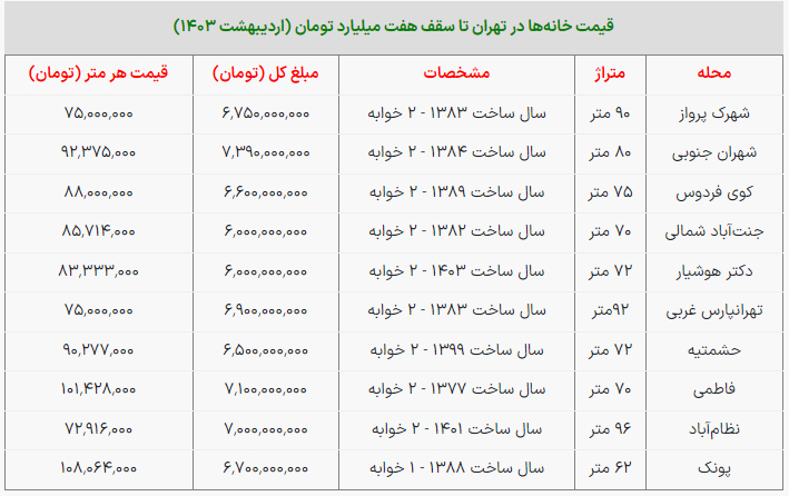 به گزارش سایت طلا، اگر قصد خرید خانه در تهران را دارید و حداکثر بودجه شما هفت میلیارد تومان است، در ادامه به بررسی آپارتمانهایی میپردازیم که با این سرمایه میتوانید خریداری کنید.