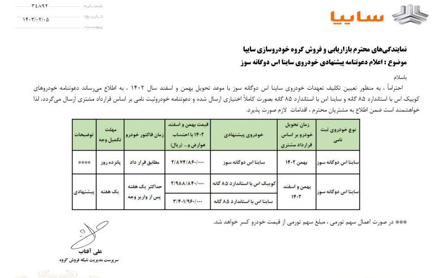 شرکت سایپا شرایط تکمیل وجه و تبدیل اختیاری خودرو ساینا با موعد تحویل بهمن و اسفند ۱۴۰۲ را اعلام کرد.