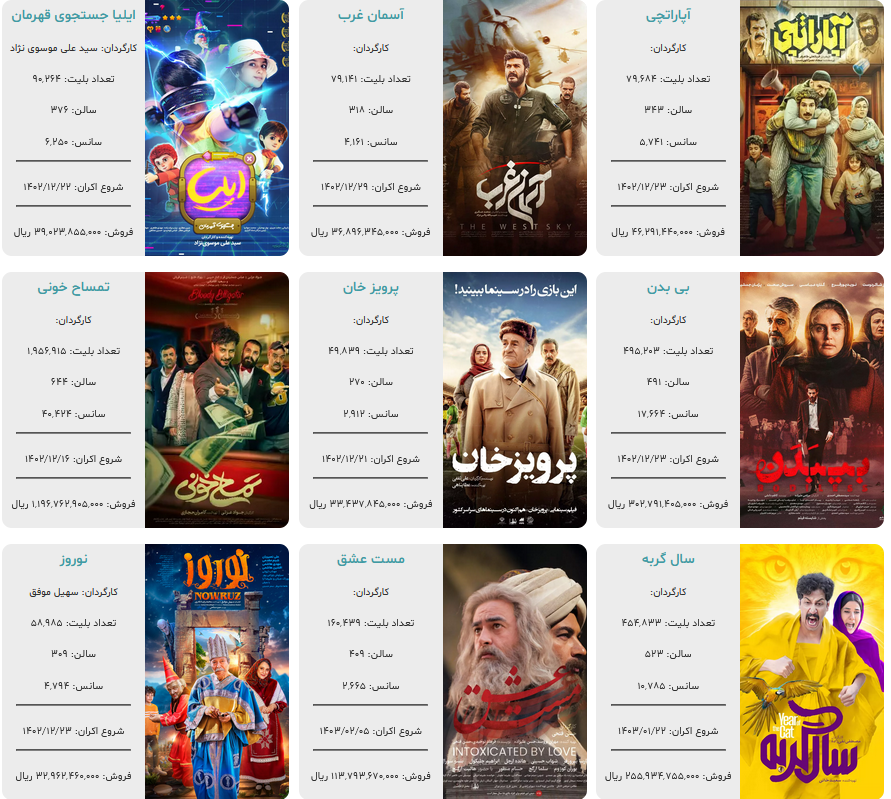 در جدول فروش سینمای ایران در حال حاضر تمساح خونی به کارگردانی جواد عزتی با بیش از 119 میلیارد تومان فروش در آستانه 2 میلیونی شدن تماشاگران خود است و پس از این فیلم درام اجتماعی «بیبدن» با بیش از 30 میلیارد فروش و کمدی «سال گربه» با 25 میلیارد و 500 میلیون تومان فروش در رتبههای دوم و سوم قرار دارند.