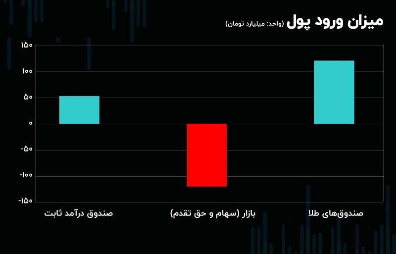 اکوایران ورود پول در صندوقهای درآمد ثابت، صندوقهای طلا و بازار سهام را بررسی کرده است. با توجه به نموداری که رسم شده است در روز جاری همزمان با کاهش حجم معاملات خرد در بازار سرمایه، ورود پول نیز به بازار سهام منفی شده و حدود ۱۱۹ میلیارد تومان پول از بازار سهام خارج شده است. پس از چند روز ورود پول حقیقی این حرکتی متفاوت از جانب سهامداران است و به نظر میرسد صاحبان سرمایه تا رسیدن اخبار خوب امروز وارد فاز احتیاطی شدهاند.
