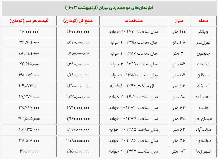 اگر قصد خرید خانه دارید و حداکثر بودجه شما ۲ میلیارد تومان در ادامه به بررسی قیمت آپارتمانهایی که سقف قیمت آنها دو میلیارد است میپردازیم.