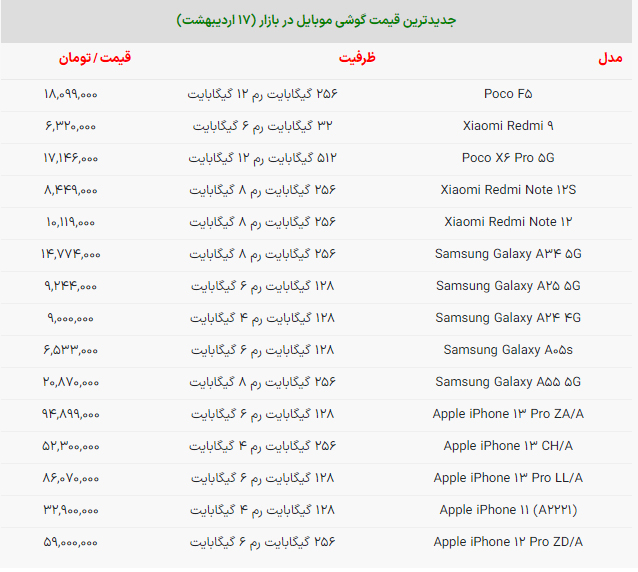 برای اطلاع از قیمت مدلهای دیگر گوشی آیفون، سامسونگ و شیائومی جدول زیر را بخوانید.