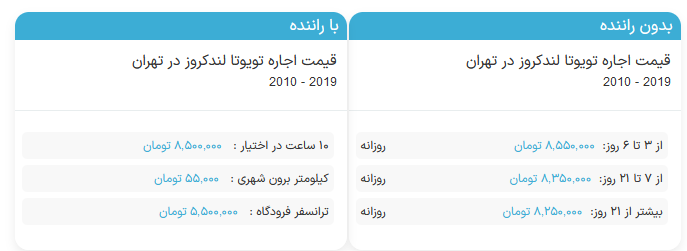 اجاره لندکروز همراه با راننده هم برای مدت ۱۰ ساعت ۸.۵ میلیون تومان می‌شود.