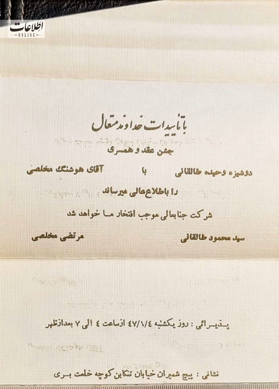 کارت عروسی دختر آیتالله طالقانی در سال ۱۳۴۷ + عکس