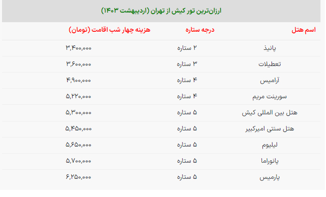 قیمت تور ارزان کیش برای ۴ شب اقامت + جدول