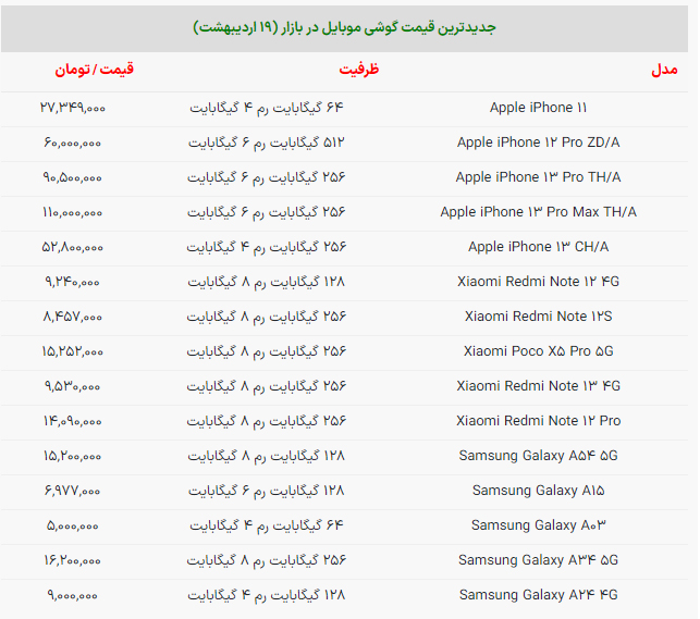برای اطلاع از قیمت مدلهای دیگر گوشی سامسونگ، آیفون و شیائومی جدول زیر را بخوانید.