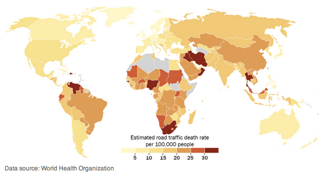 تصویر زیر از سازمان بهداشت جهانی، نرخ مرگ و میر ناشی از تصادفات جاده ای را به ازای هر ۱۰۰ هزار نفر به تفکیک کشورها نشان می دهد. همانطور که از این تصویر مشخص است، خاورمیانه و آفریقا بیشترین نرخ تصادفات جاده ای را دارند.