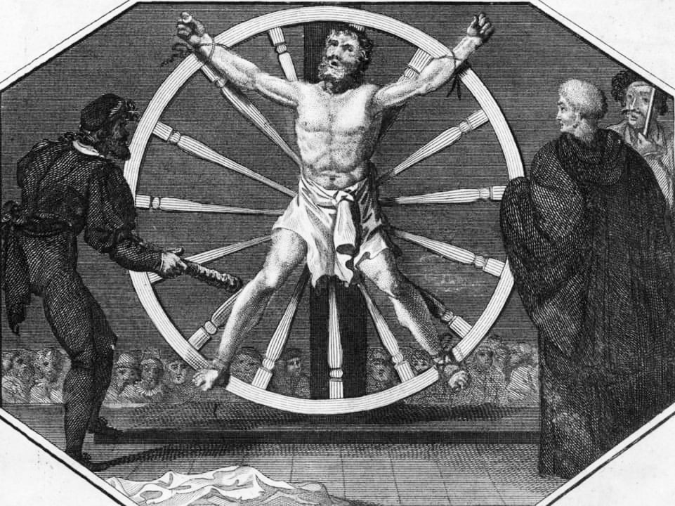 شکنجهگران میخهایی را از پشت به چرخ میزدند تا وارد بدن فرد شده و آسیب بیشتری را وارد کند. سپس با چوب آنقدر به دستان مجرم ضربه میزدند تا استخوان سالمی باقی نماند. در این زمان فرد دیگر توانایی نگهداشتن بدن خود را نداشت، بنابراین با طناب محکم به چرخ بسته میشد و در یک مکان عمومی قرار میگرفت. سپس نوبت شکنجههای دیگر بود تا دردناک ترین مرگ تاریخ را تکمیل کنند.