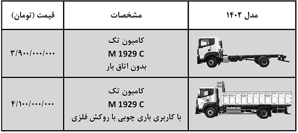 براساس این اطلاعیه کامیون تک ۱۹۲۹ بدون اتاق بار با قیمت ۳ میلیارد و ۹۰۰ میلیون تومان و موعد تحویل ۳۰ روزه و کامیون تک ۱۹۲۹ با کاربری(باری چوبی با روکش فلزی) با قیمت ۴ میلیارد و ۱۰۰ میلیون تومان و موعد تحویل ۴۵ روزه با مدل ۱۴۰۲ به فروش خواهد رسید.