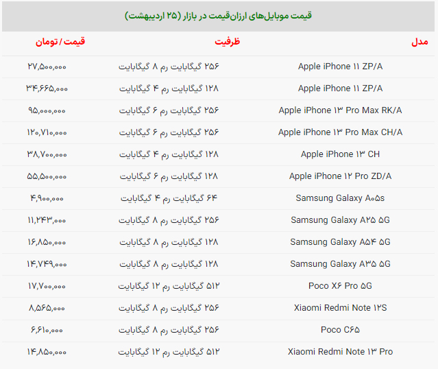برای اطلاع از قیمت انواع مدل گوشی شیائومی، آیفون و سامسونگ در بازار آنلاین جدولی را که در ادامه آماده کردهایم بخوانید.