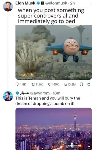 ایلان ماسک در برنامه ایکس(توییتر) تصویری عجیب که بمباران در تهران را نشان میدهد منتشر کرد که واکنش کاربران را به دنبال داشت. او در این توییت نوشت: وقتی یک پست خیلی جنجالی گذاشتی و بلافاصله میری بخوابی!