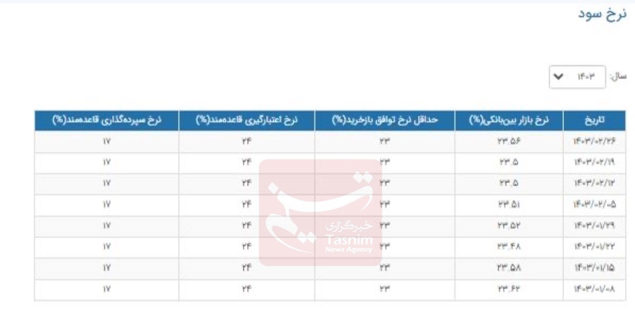 این نرخ در هفته پایانی اسفندماه سال 1402 به 23.66 درصد رسیده بود که بالاترین نرخ بهره بین بانکی از آبان‌ماه به بعد محسوب می‌شود. بیشترین رکورد این نرخ در هفته نخست مهر 1402 ثبت شده است. نرخ بهره بین بانکی در پایان هفته منتهی به 5 مهرماه سال 1402 با رکوردشکنی 10 سال به 23.80 درصد افزایش یافته بود؛ البته بعد از آن روند کاهشی نرخ سود بین بانکی آغاز شد و در هفته نخست آبان‌ماه به 23.71 درصد کاهش یافت و بعد ان آن وارد کانال‌های پایین‌تر شد.