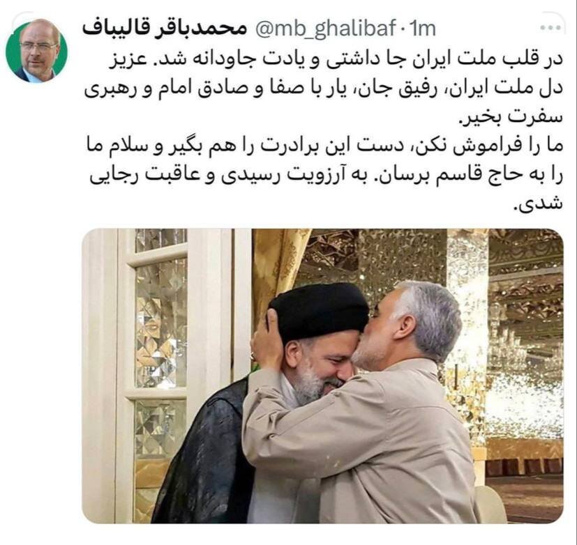 در پی شهادت ابراهیم رئیسی رئیس جمهور کشورمان و هیات همراه وی در حادثه بالگرد، محمدباقر قالیباف رئیس مجلس شورای اسلامی در شبکه اجتماعی ایکس با انتشار عکسی از وی به همراه شهید سردار قاسم سلیمانی نوشت: