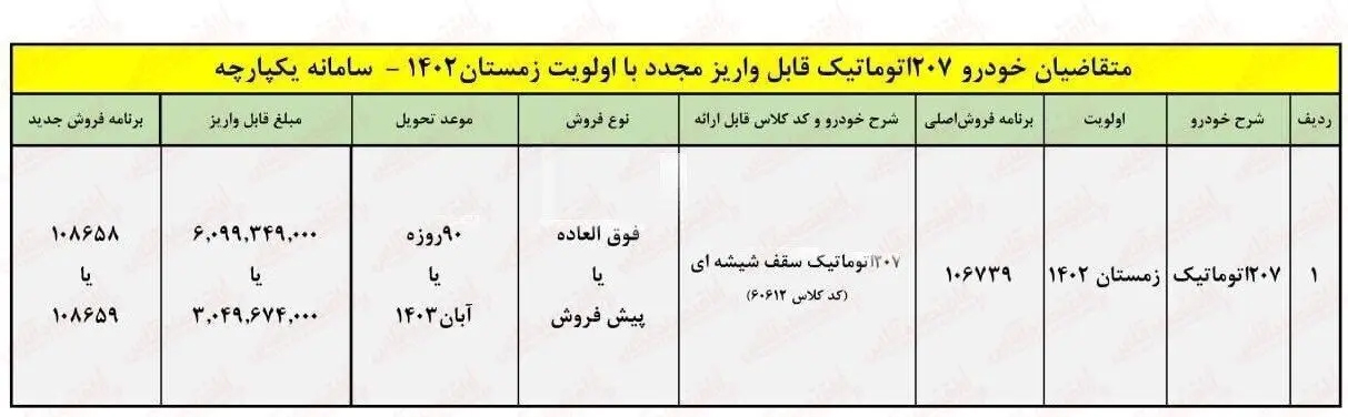 ثبت نام پژو ۲۰۷ به صورت فروش فوری و پیش فروش است که جزییات آن را در تصویر زیر بخوانید.