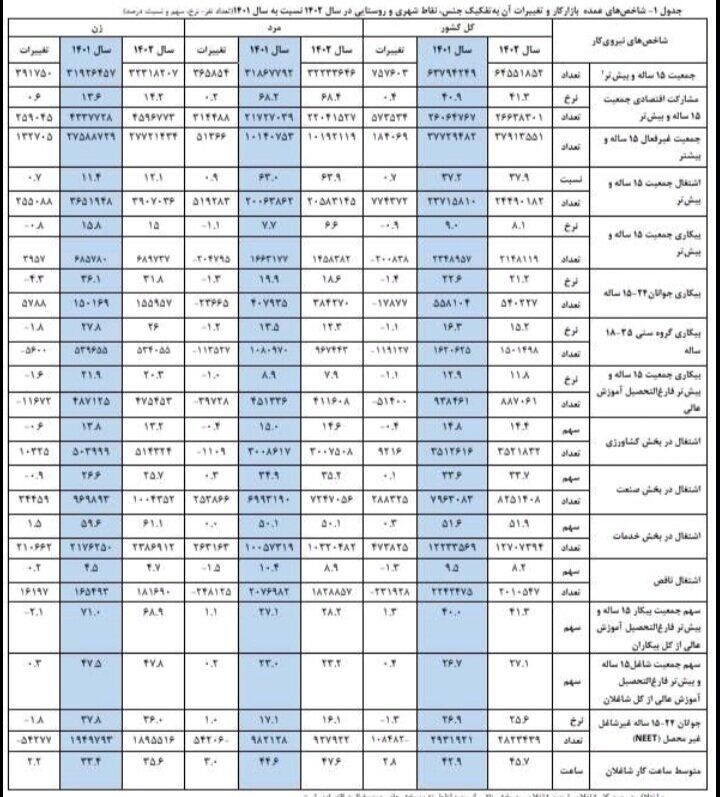 تازهترین آمارها مربوط به نرخ بیکاری ۱۴۰۲ منتشر شد که براساس آن، نرخ بیکاری به ۸.۱ درصد رسیده و به این ترتیب، تعداد بیکاران ۲ میلیون و ۱۴۸ هزار نفر اعلام شده است. این آمار از بین ۶۵ میلیون و ۵۵۱ هزار و ۸۵۱ نفر جمعیت ۱۵ ساله و بیشتر گرفته شده است که براساس آن، نرخ مشارکت اقتصادی به ۴۱.۳ درصد تغییر کرده است. همچنین جمعیت غیرفعال ۳۷ میلیون و ۹۱۳ هزار و ۵۵۱ نفر اعلام شده است.