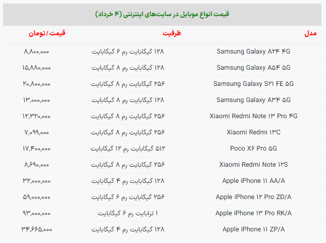 برای اطلاع از قیمت انواع مدل گوشی آیفون، سامسونگ و شیائومی در بازار آنلاین جدولی را که در ادامه آماده کردهایم بخوانید.