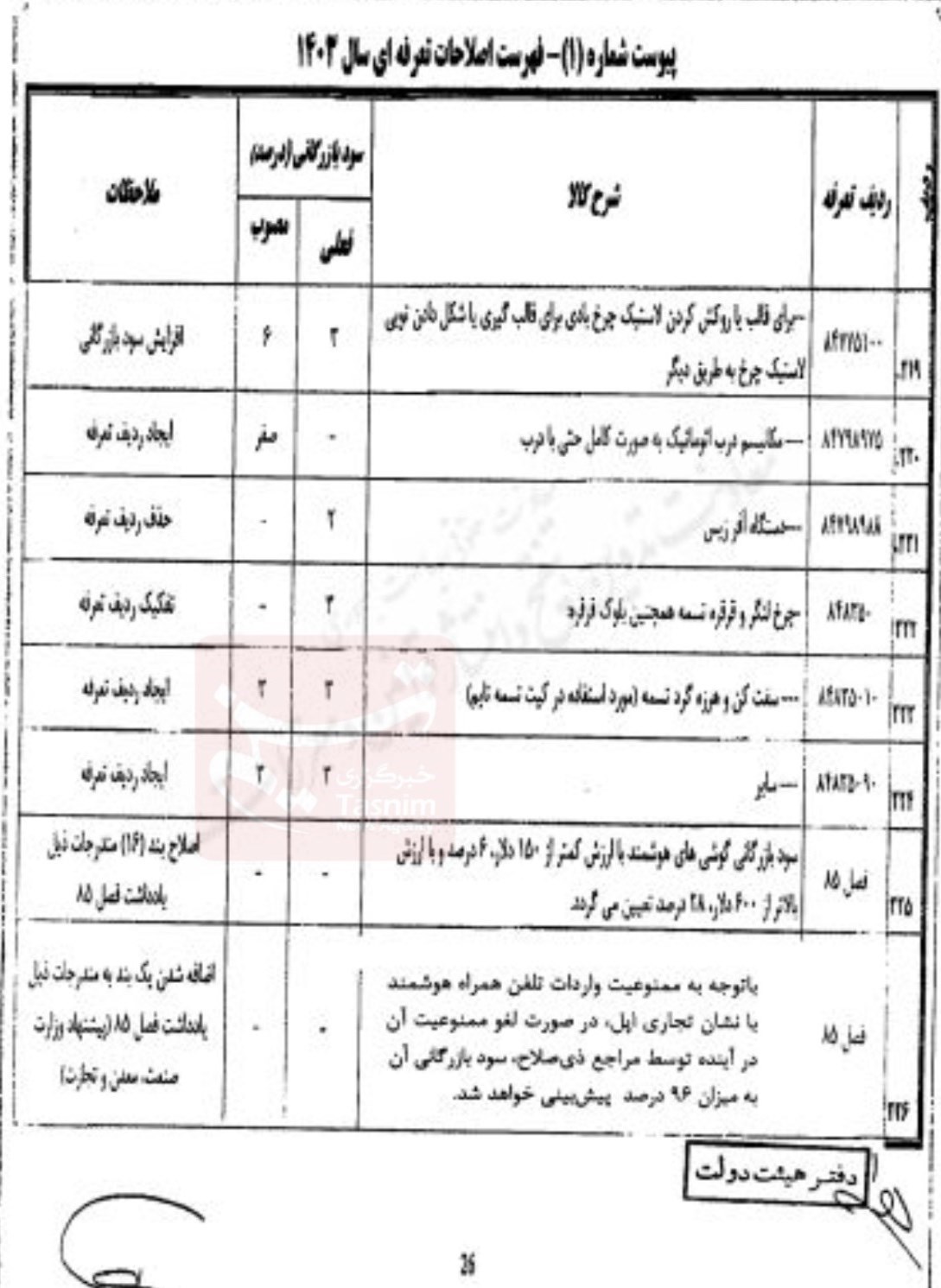 در این بخش آمده است: «با توجه ممنوعیت واردات تلفن همراه هوشمند با نشان تجاری اپل، در صورت لغو ممنوعیت آن در آینده توسط مراجع ذیصلاح، سود بازرگانی آن به میزان 96 درصد پیشبینی خواهد شد.»