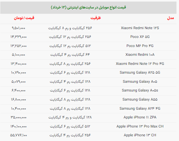 در بازار امروز ۱۲ خرداد ۱۴۰۳، قیمت انواع گوشی موبایل تغییری خاصی نداشته و تقریبا با همان قیمتهای قبلی فروخته میشوند، به طوری که گوشی شیائومی مدل ردمی نوت ۱۳ با فضای ذخیرهسازی