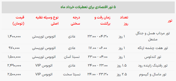 در این مطلب به بررسی قیمت ۵ تور اقتصادی برای تعطیلات آخر هفته میپردازیم.