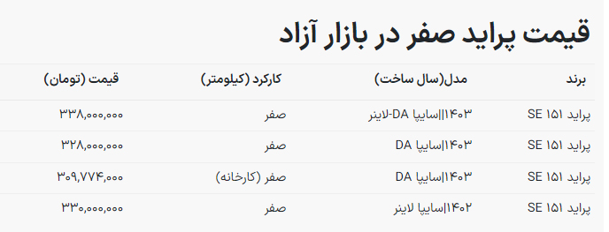 به گزارش سایت طلا، بر اساس جدیدترین قیمت کارخانه محصولات سایپا، قیمت کارخانه پراید وانت ۱۴۰۳ مدل ۱۵۱ SE و DA به ۳۰۹ میلیون تومان رسیده است. همچنین قیمت پراید وانت در بازار آزاد نیز ۳۲۸ میلیون تومان شده است. قیمت پراید وانت صفر مدل ۱۴۰۳ با DA-لاینر نیز ۳۳۸ میلیون تومان است.