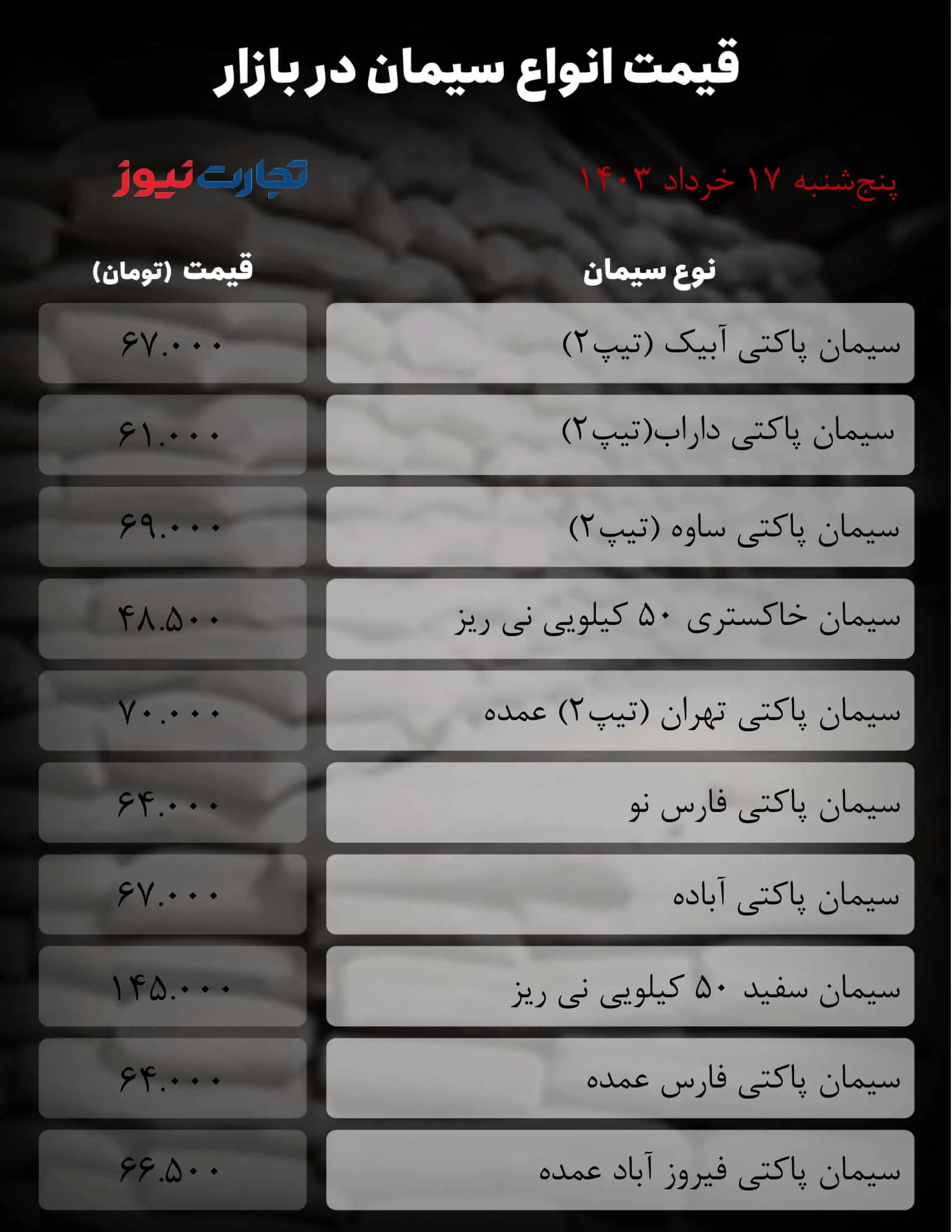 تجارت نیوز در گزارشی نوشت: قیمت دلار در حالیکه هفته نیمهتعطیل و رکودی را سپری میکند بازار معاملات را هم متأثر کرده به طوریکه بهای سیمان همچنان بدون افت و خیز و با تسلط کامل گزارش میشود. در جدول زیر میتوان بهای انواع سیمان را مشاهده کرد.