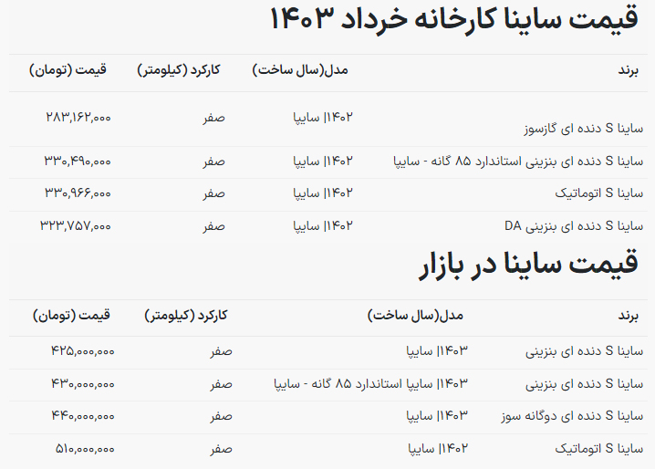 بر اساس قیمت کارخانه محصولات سایپا ، قیمت کارخانه ساینا صفر مدل گازسوز به ۲۸۳ میلیون تومان رسیده است
