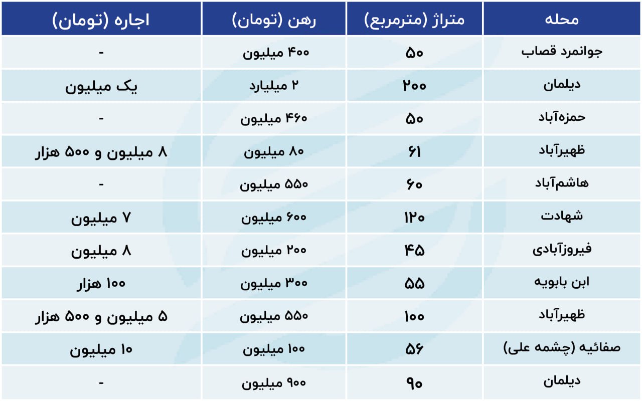 مشاهدات ما نشان میدهد که برای رهن کامل واحدی 75 متری و 8 سال ساخت در دیلمان، 650 میلیون تومان و در محله سرتخت، برای آپارتمانی 115 متری، نوساز و دارای امکانات، یک میلیارد و 450 میلیون تومان قیمتگذاری شده است.