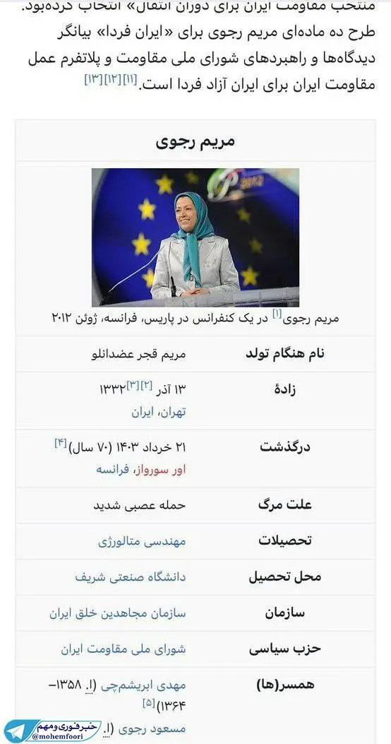 ضعیت مریم رجوی، سرکرده گروهک منافقین که چند روز قبل وخیم گزارش شده بود، ظاهرا به مرگ منتهی شده است. صفحه ویکی پدیا نیز تاریخ مرگ او در پاریس را ۲۱ خرداد ثبت کرده است.