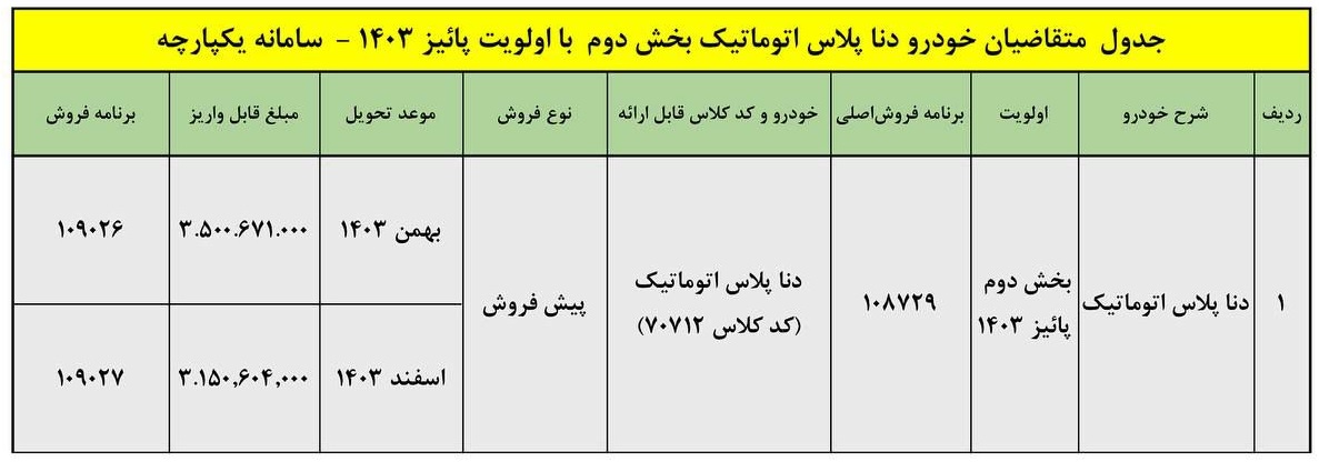 به استحضار میرساند شرایط انتخاب و واریز وجه به تعداد محدود برای متقاضیان خودرو دنا پلاس اتوماتیک با اولویت پاییز 1403 سامانه یکپارچه مطابق جدول پیوست ایجاد شده است. لذا متقاضیان فوق میتوانند طی مدت 10 روز یا زمان تکمیل ظرفیت با مراجعه به سایت فروش اینترنتی ایران خودرو نسبت به واریز وجه اقدام نمایند.