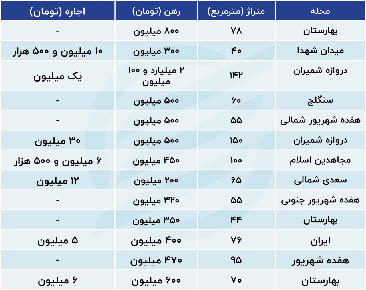 در محله ایران، رهن کامل واحدی 70 متری و 20 سال ساخت، 630 میلیون تومان و در حوالی میدان شهدا، رهن کامل واحدی 75 متری و 13 سال ساخت، یک میلیارد و 200 میلیون تومان تعیین شده است.
