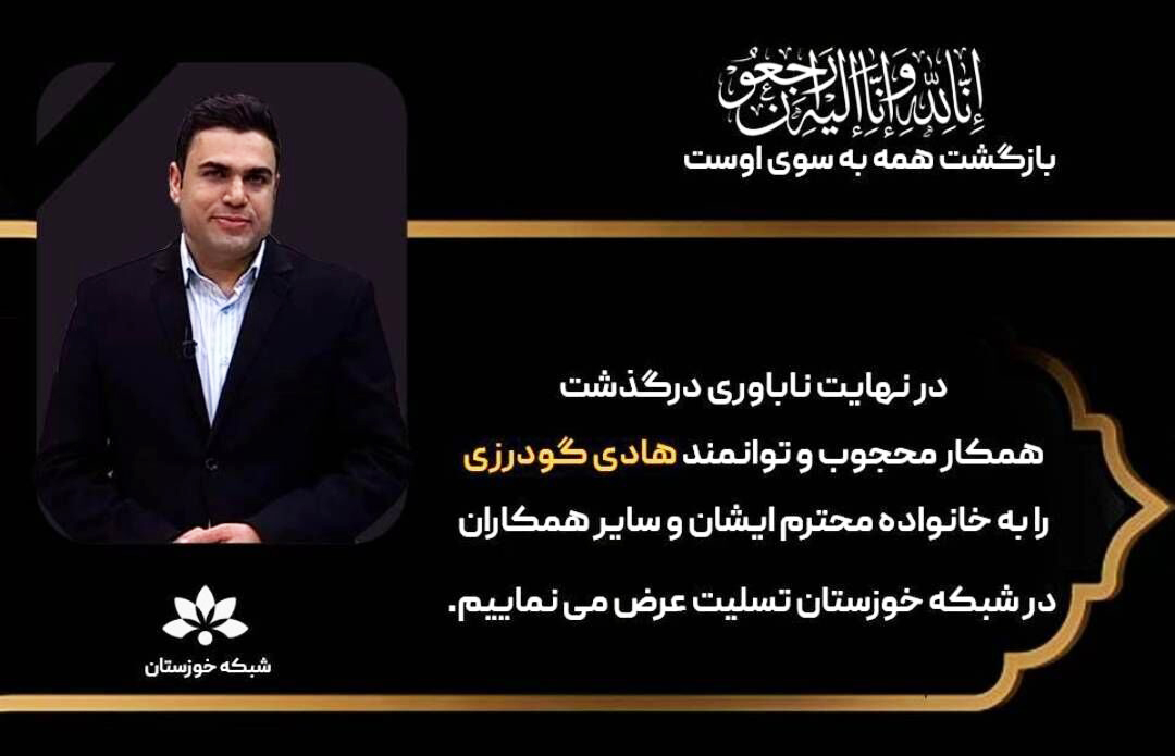 هادی گودرزی مجری جوان صدا و سیمای خوزستان امروز به علت سانحه رانندگی در محور اهواز _خرمشهر دارفانی را وداع گفت.