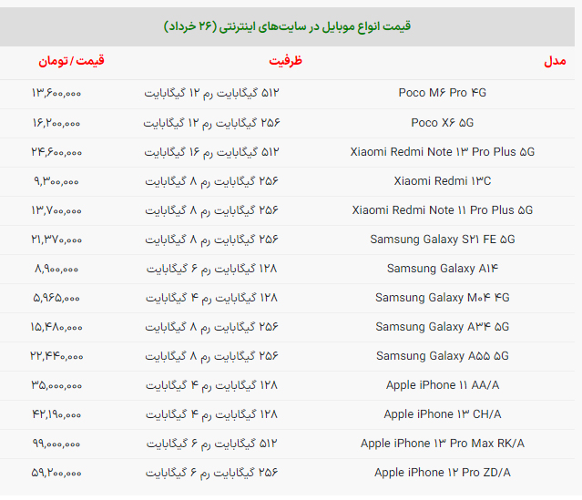 اگر میخواهید از قیمت انواع گوشی آیفون و مدلهای دیگر شیائومی و سامسونگ مطلع شوید، جدولی را که آماده کردهایم بخوانید.