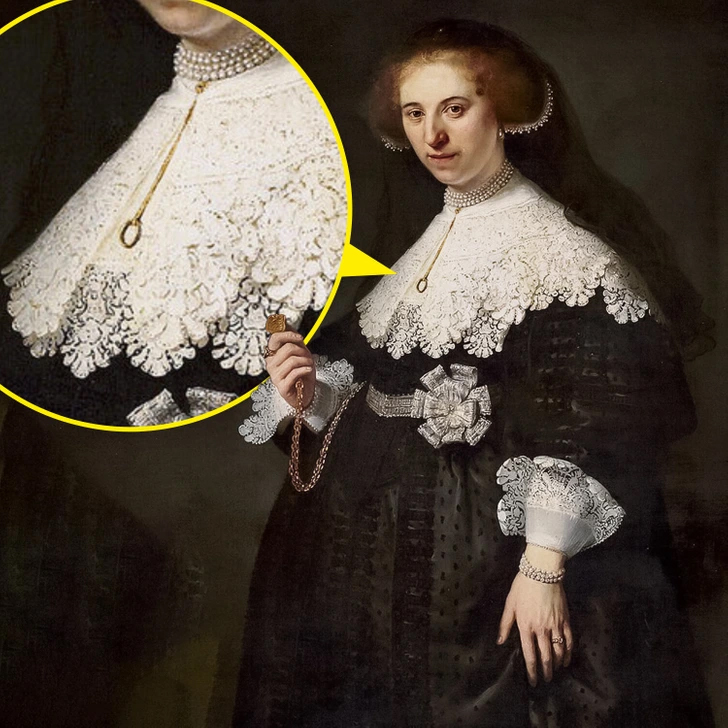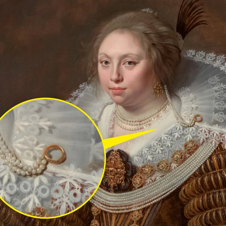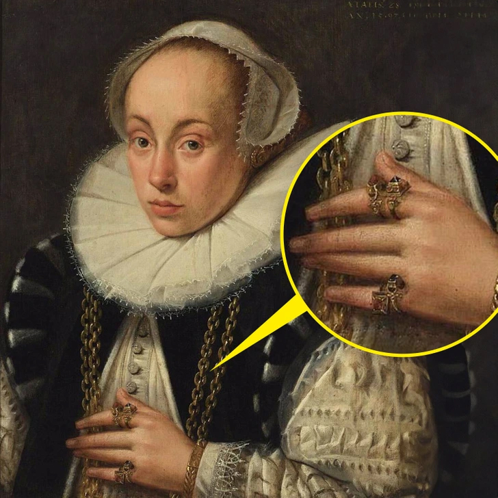 در قرن هفدهم، برخی از جواهرات نماد غم و اندوه شخصی بودند. به عنوان مثال، ارمگارد الیزابت ون دورث، در تصویر بالا، نامزدش را در سن ۲۳ سالگی از دست داد. برخی از محققان حدس میزنند که حلقه طلایی که توسط رشتهای از مروارید به موهای او متصل شده زمانی توسط محبوبش به او داده شده و نماد سوگواری او بوده است.