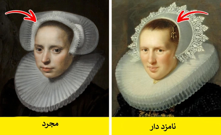 یقههای بلند باعث میشد که زنان موهای خود را زیر کلاههایی که با سنجاقهای مروارید تزئین میشد، پنهان کنند. قرار دادن این سنجاقها نشاندهنده وضعیت تأهل بود: زنان متاهل آن را در سمت راست میپوشیدند، زنانی که نامزد داشتند در سمت چپ و زنان مجرد اصلاً از این سنجاقها استفاده نمیکردند.