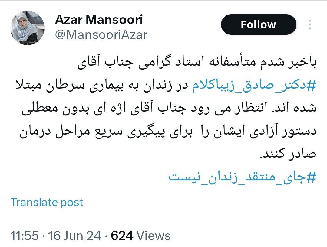 آذر منصوری، رئیس جبهه اصلاحات ایران، در شبکه اجتماعی ایکس نوشت: باخبر شدم متأسفانه استاد گرامی جناب آقای دکتر صادق زیباکلام در زندان به بیماری سرطان مبتلا شدهاند. انتظار میرود جناب آقای اژهای بدون معطلی دستور آزادی ایشان را برای پیگیری سریع مراحل درمان صادر کنند.