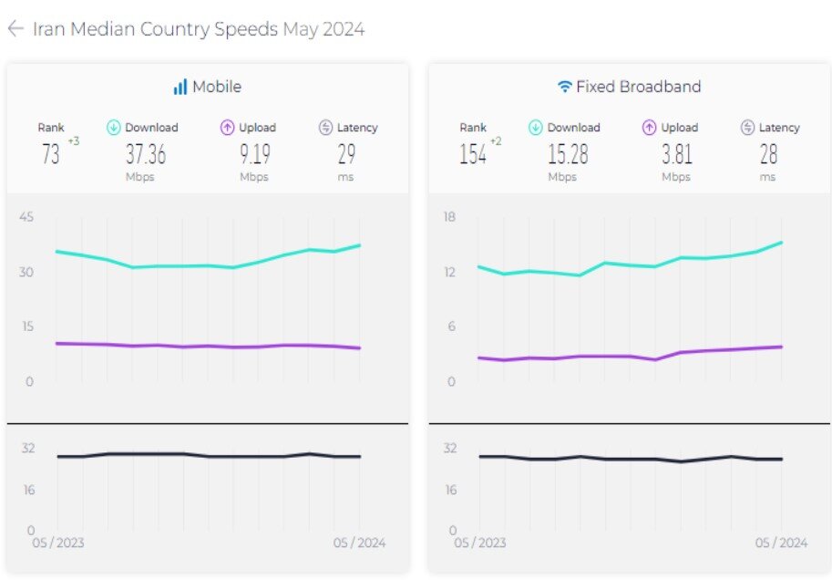 همچنین طبق این گزارش میانه سرعت اینترنت موبایل ایران در می ۲۰۲۴ میلادی ۳۷.۳۶ مگابیت برثانیه است. جایگاه ایران با ۳ پله صعود رده ۷۳ فهرست کشورهایی با بیشترین میانه سرعت اینترنت موبایل است. از سوی دیگر میانه سرعت اینترنت ثابت کشور نیز ۱۵.۲۸ مگابیت برثانیه و جایگاه آن نسبت به ماه قبل با ۲ پله صعود ۱۵۴ بوده است.