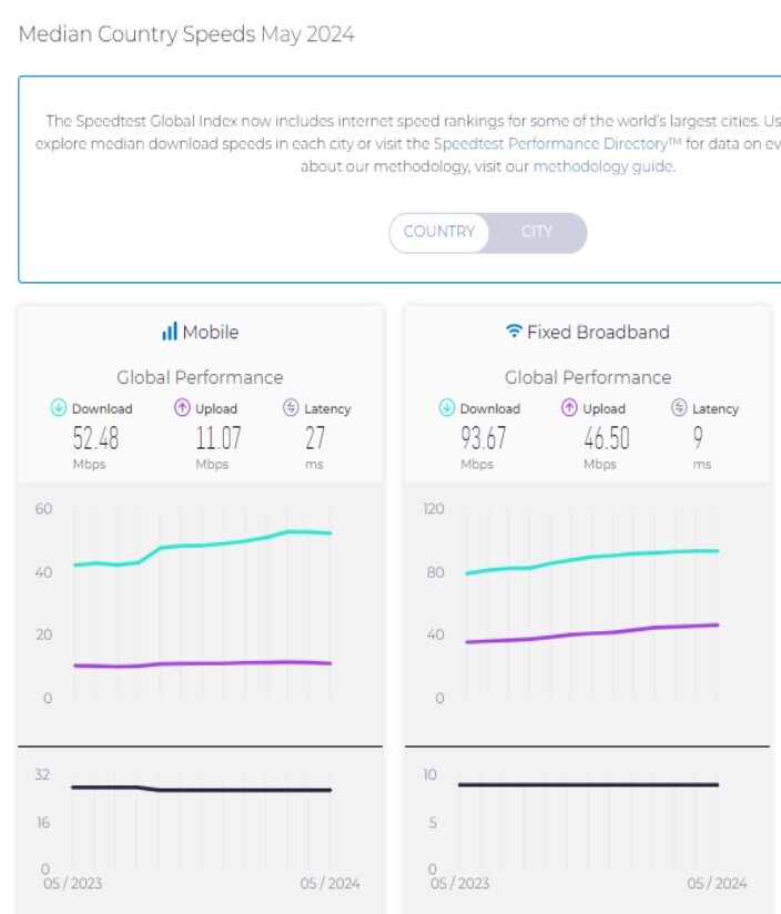به گزارش سایت طلا،جدیدترین گزارش اسپیدتست مربوط به میانه سرعت اینترنت موبایل و ثابت کشورها در ماه می ۲۰۲۴ میلادی منتشر شد. این گزارش نشان میدهد در پنجمین ماه میلادی میانه سرعت جهانی اینترنت موبایل ۵۲.۴۸ و میانه سرعت جهانی اینترنت ثابت ۹۳.۶۷ مگابیت برثانیه بوده است.
