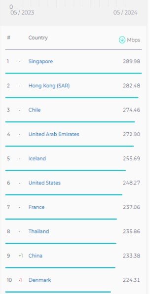 در رده بندی کشورهایی با بیشترین میانه سرعت اینترنت ثابت در می ۲۰۲۴ میلادی جایگاه کشورها نسبت به آوریل تغییر چندانی نداشته است. به طوریکه جایگاه کشورها در ردههای یکم تاهشتم در این رده بندی نسبت به ماه قبل ثابت بوده است. طبق وب سایت اسپید تست در رده یکم سنگاپور با میانه سرعت ۲۸۹.۹۸ مگابیت برثانیه، در جایگاه دوم هنگ کنگ با میانه سرعت ۲۸۲.۴۸ مگابیت برثانیه و در رده سوم نیز شیلی با میانه سرعت ۲۷۴.۴۶ مگابیت برثانیه قرار دارند.
