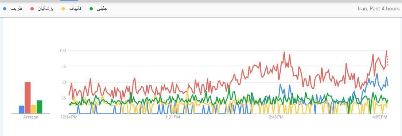 بنابر گزارش هم میهن، همان طور که جستجوهای گوگل نشان میدهد، در شرایطی که قالیباف (رنگ زد) و جلیلی (رنگ سبز) در انتخابات حضور دارند، این ظریف (رنگ آبی) است که بیشتر مورد توجه مردم قرار دارد. به نظر میرسد با میزگرد امروز، انتخابات وارد سطح دیگری شود و سرعت رشد پزشکیان در نظرسنجیها افزایش یابد.