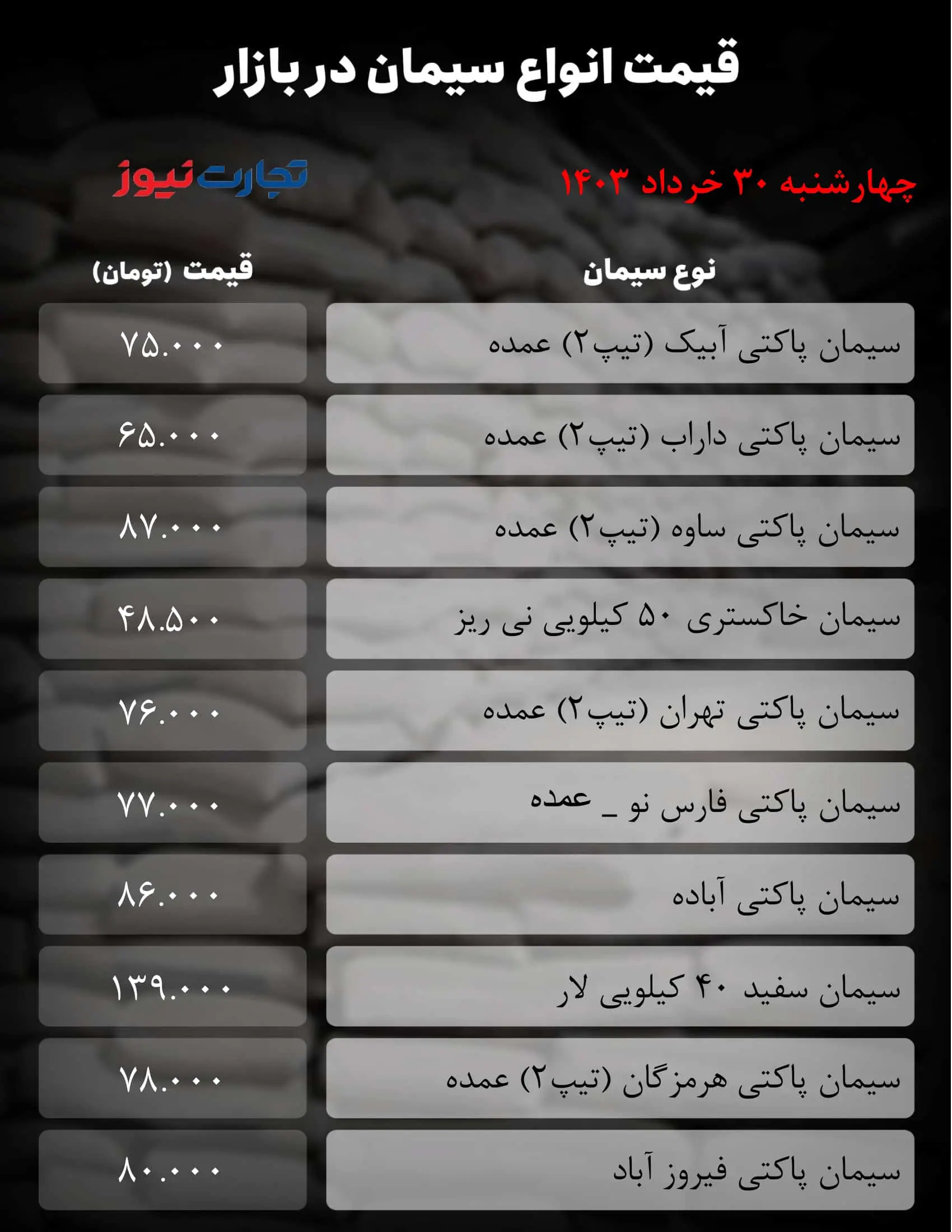 سیمان پاکتی فارس نو _ عمده هم با بهای ۷۷ هزار تومان به چشم میخورد. سیمان پاکتی تهران (تیپ ۲) عمده نیز با ۱۱ هزار تومان افزایش با قیمت ۷۶ هزار تومان به دست مصرفکننده میرسد.