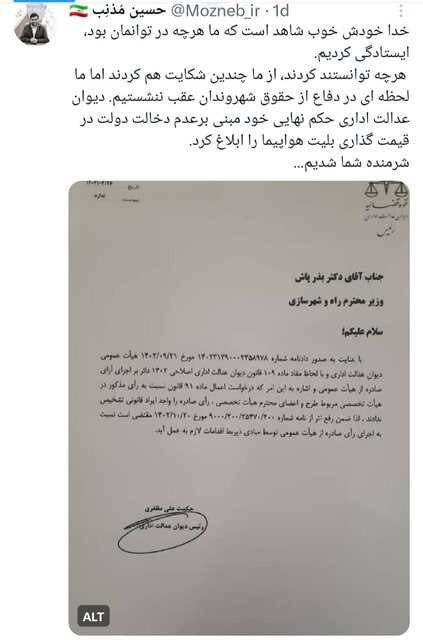 به گزارش سایت طلا،در توییت حسین مذنب - مدیرکل دفتر بازرسی و حقوق شهروندی وزارت راه و شهرسازی درباره رای دیوان عدالت اداری ادامه آمده است: