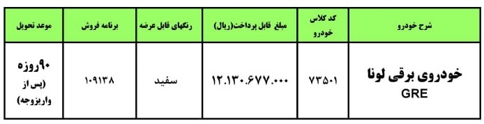 فراخوان فروش فوق‌العاده خودروی وارداتی برقی لونا