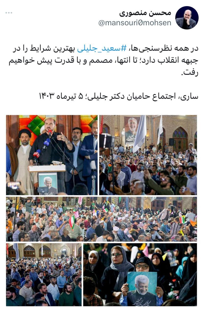 محسن منصوری رئیس ستاد انتخاباتی سعیدجلیلی تصاویری از اجتماع حامیان وی در شهر ساری در ۵ تیرماه ۱۴۰۳ در شبکه اجتماعی ایکس منتشر کرده و نوشته است: