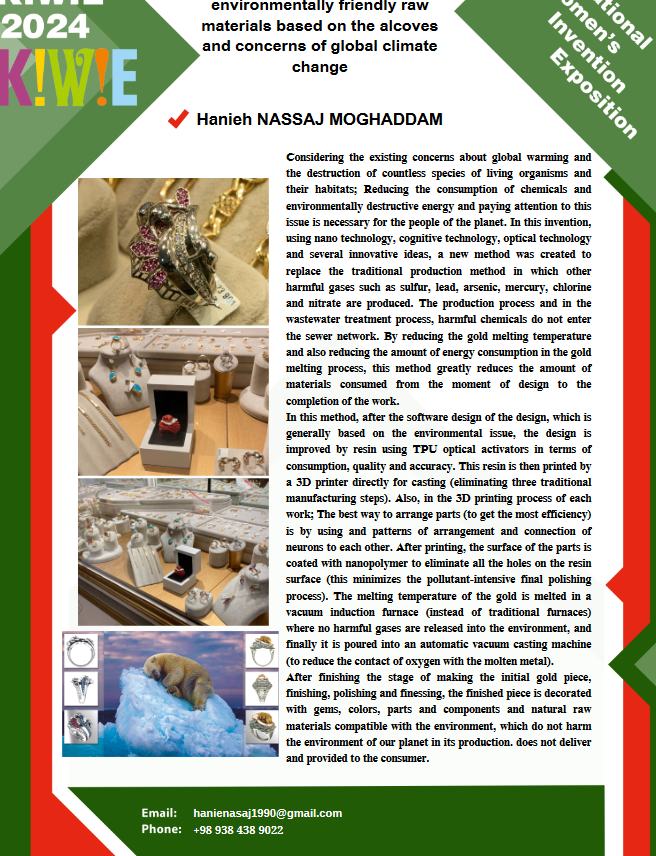 حانیه نساج مقدم در مصاحبه اختصاصی با سایت طلا گفت: طرح فناورانه و کارآفرینی خود را با موضوع جواهرات پایدار با همکاری RIT ( تیم تحقیقاتی نوآوری فدراسیون جهانی اختراعات) به کشور کره جنوبی ارسال کردیم که مورد توجه و استقبال داوران جامعه بین الملل قرار گرفت و موفق به کسب مقام دوم مسابقات بانوان کارآفرین و نوآور 2024 جهان در کشور کره جنوبی و همچنین جایزه ویژه مرکز تحقیقات و نوآوری تایلند را کسب کرد.